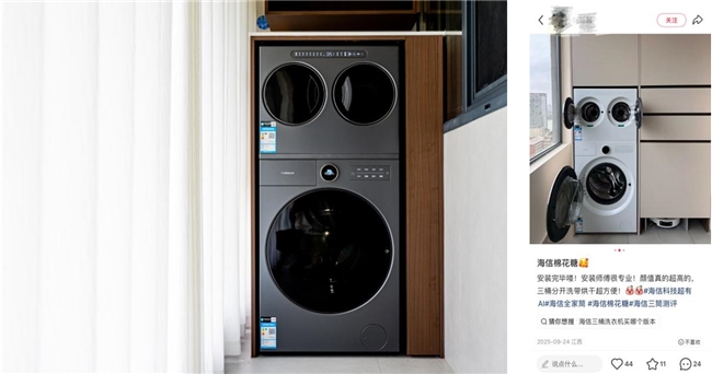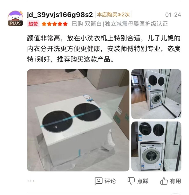 值得一提的是,海信棉花糖Ultra全家筒迷你筒(WV20G-H/WV20W)专为母婴内衣场景打造,实现婴儿衣物、内衣的专属洗烘分区,杜绝细菌交叉污染,且通过了权威母婴安全认证以及医护级内衣健康洗认证;此外,海信全家筒迷你筒配备新风冷凝式烘干技术,专门适配内衣、宝宝衣物等小件,阴雨天烘干后可直接穿着,无需等待晾晒。 下单小双筒的京东用户评价说:“颜值非常高,放在小洗衣机上特别合适,儿子儿媳的内衣分开洗更方便更健康,安装师傅特别专业,态度特i别好,推荐购买这款产品。”