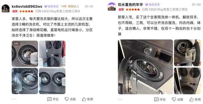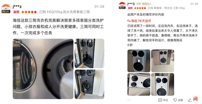 同时,海信热泵洗烘一体机棉花糖E8Q还可以在上方叠加小双筒,变成海信全家筒棉花糖E8Q三筒洗衣机(WH130E8Q+WV20G-H、WH130E8Q-1+WV20W),能实现3洗+3烘+3智能投放,既可同洗同烘也能单筒独立工作,彻底告别所有混洗将就,满足大人、孩子、内衣、深浅色的精细分区需求。有用户赞叹:“家里人多,每天要洗衣服的量比较大,所以这次主要选择海信三筒洗衣机,对比了市面上主流的几款机型,始终选择了海信棉花糖,直驱电机运行噪音小,分区洗衣干净卫生,很值得推荐!”